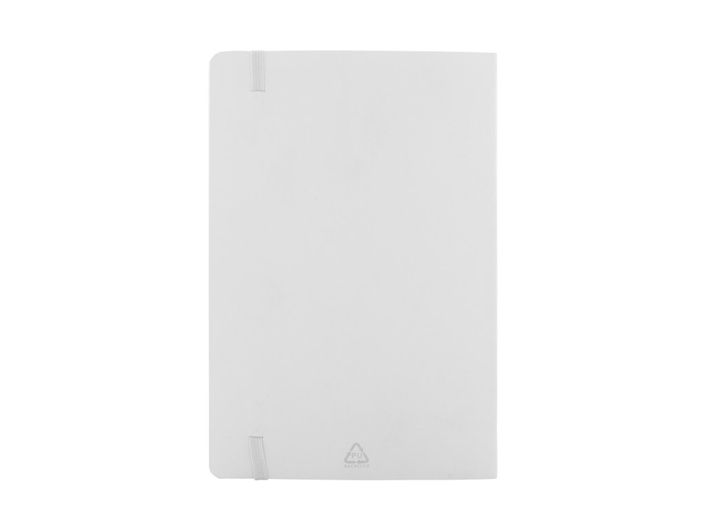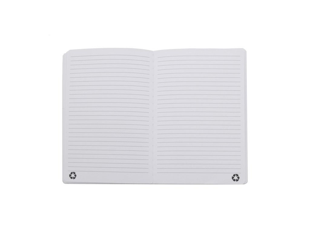 Blok A5 z recyklovanej PU kože s mäkkou väzbou s 80 linajkovými listami z recyklovaného papiera.