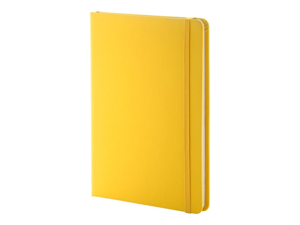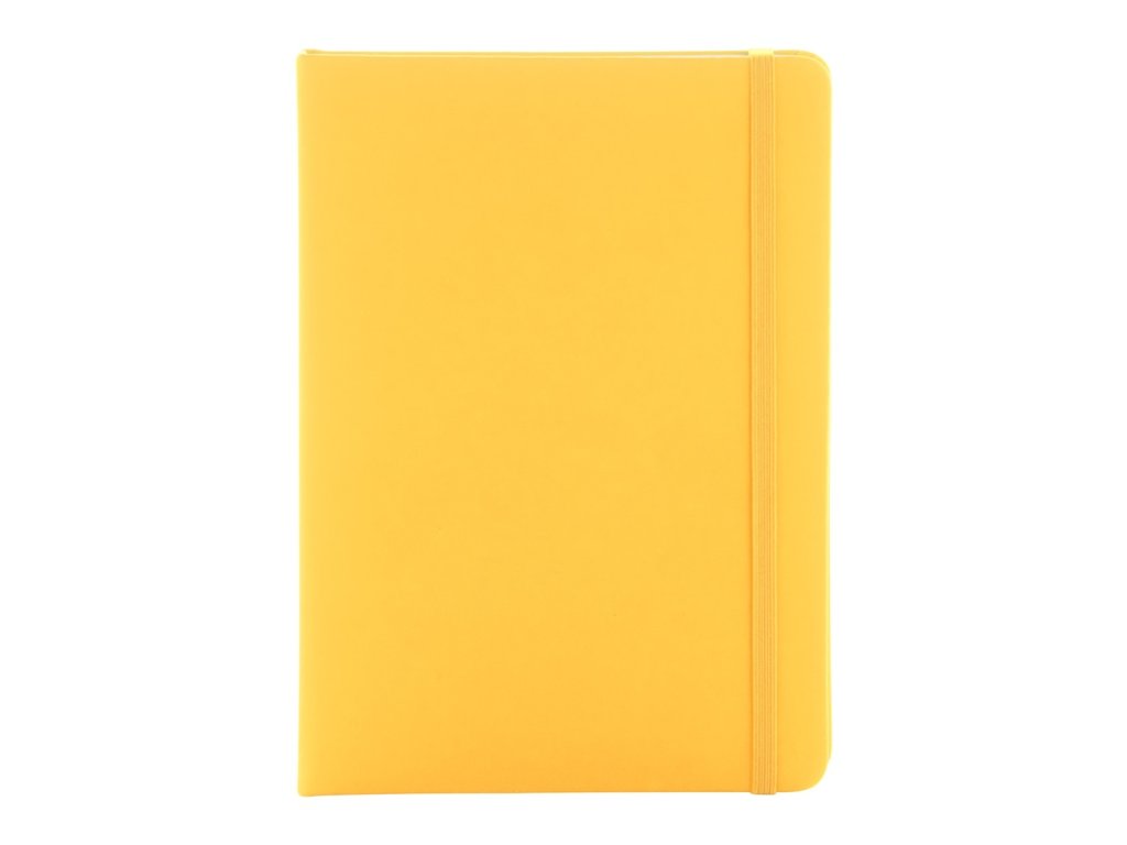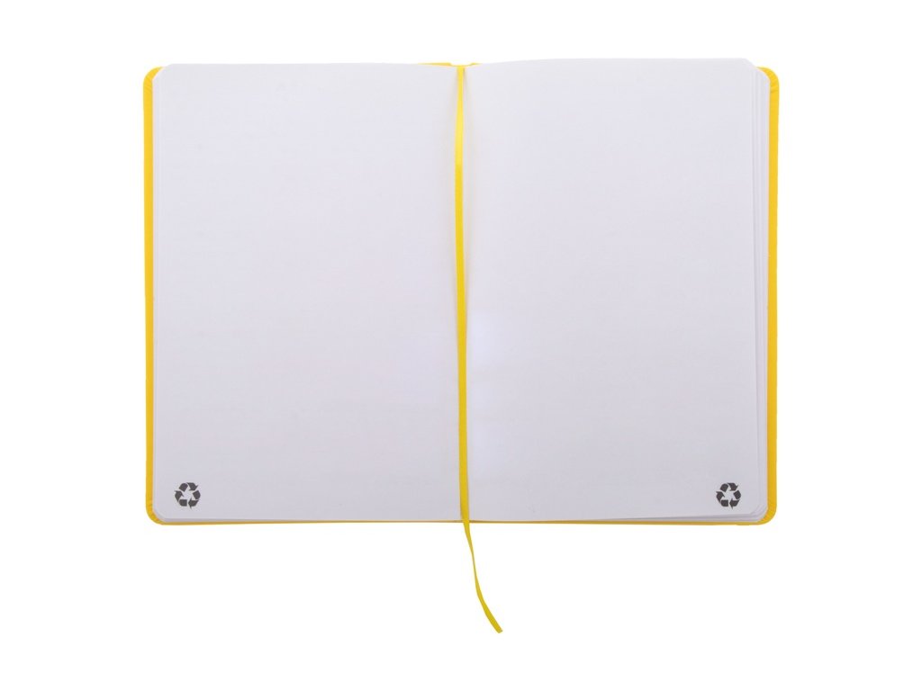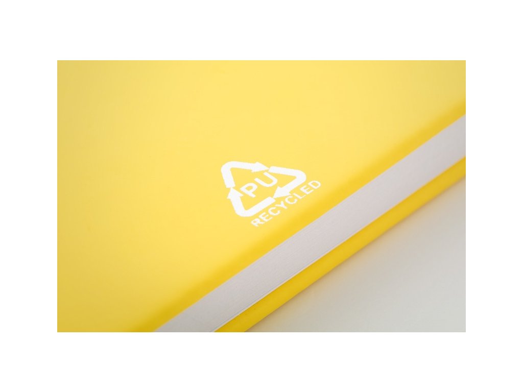 Blok A5 z recyklovanej PU kože so 100 čistými listami z recyklovaného papiera. So záložkou v zodpovedajúcej farbe a gumičkou.