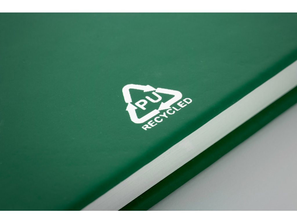 Blok A6 z recyklovanej PU kože so 100 čistými listami z recyklovaného papiera. So záložkou v zodpovedajúcej farbe a gumičkou.