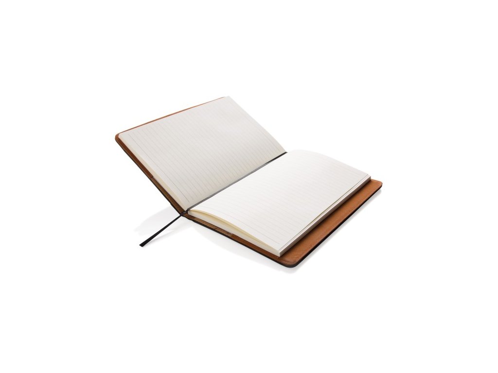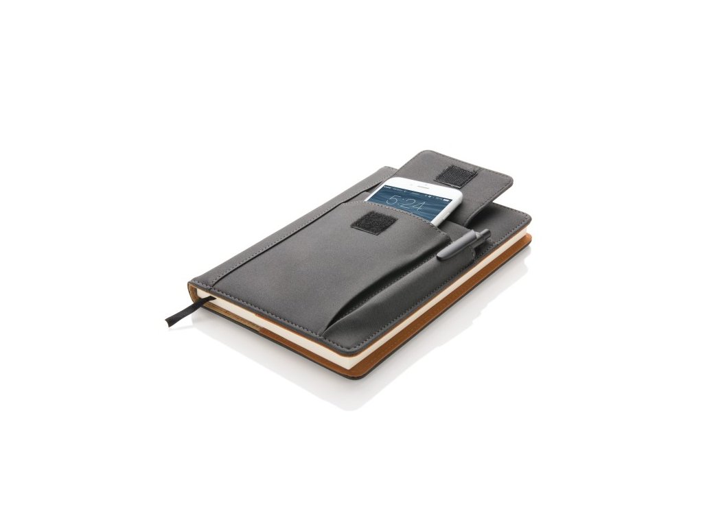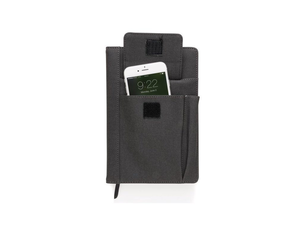 Praktický zápisník v obale z PU s predným vreckom na mobil (14 x 10 cm), priehradkou na pero a dodatočným vreckom napríklad pre tenký power bank alebo vizitky. Vrátane vymeniteľného zápisníku s čiernou záložkou a 160 linkovaným stranami o gramáži 80g/m2.