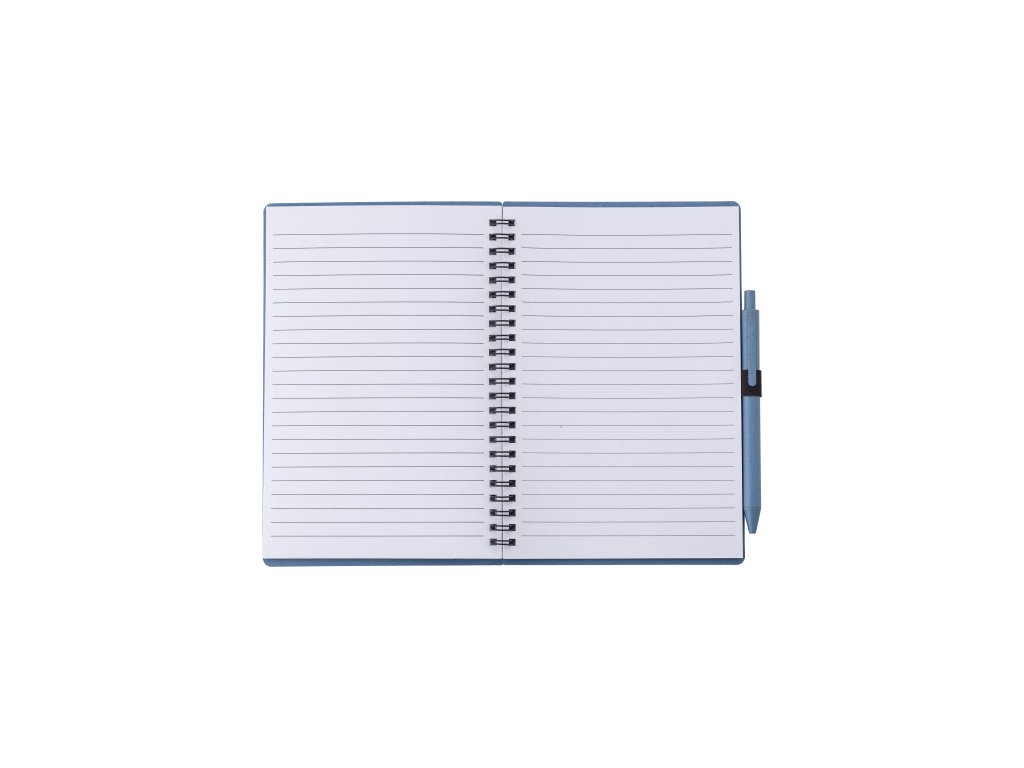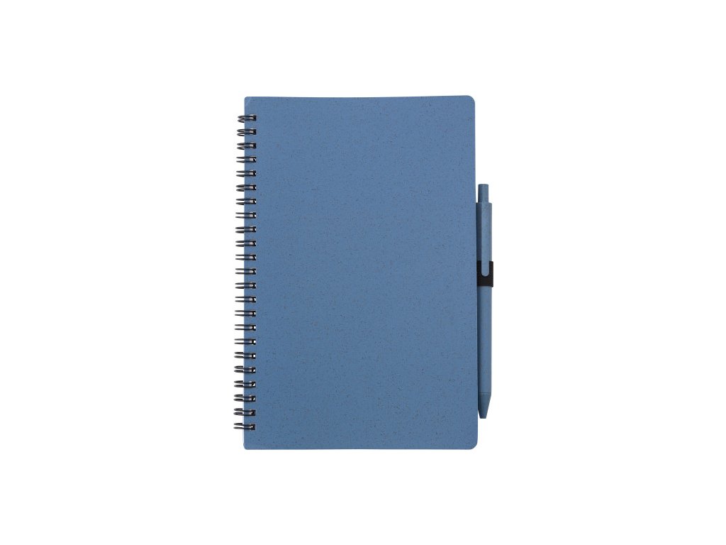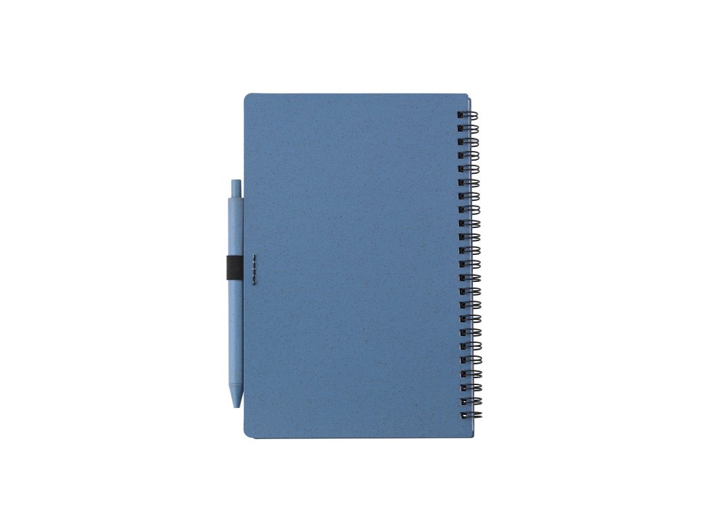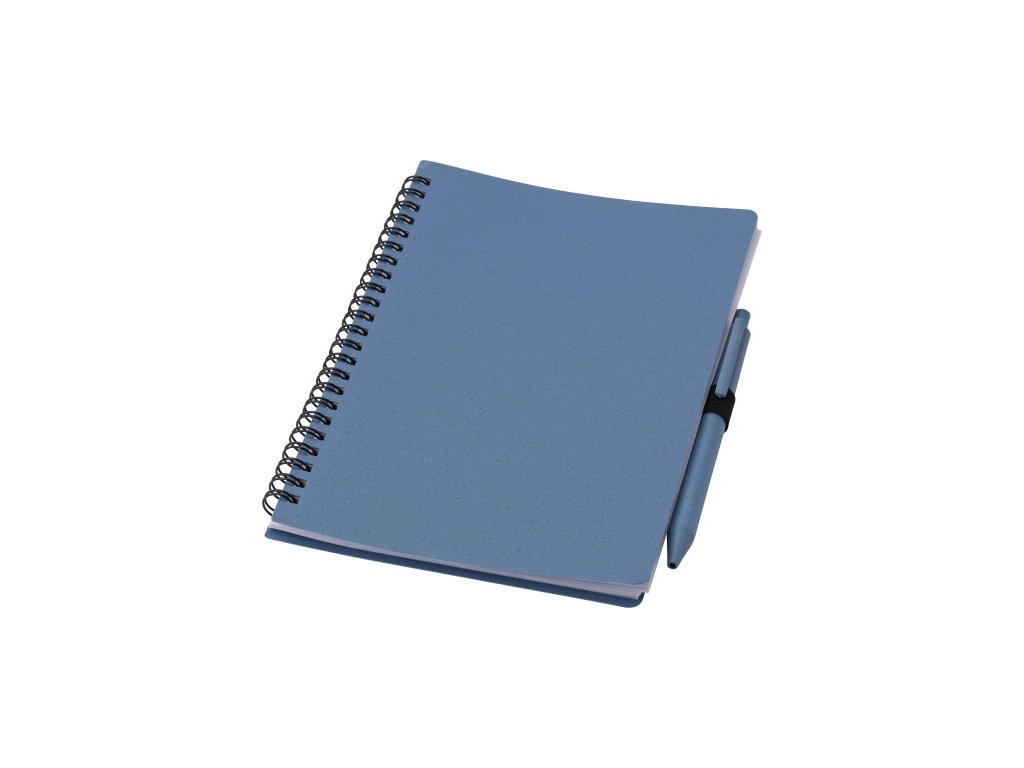 Notebook s obalom zo pšeničnej slamy a PP a perom z pšeničnej slamy, modrý atrament. Notebook má 70 linajkových listov. Veľkosť približne A5.