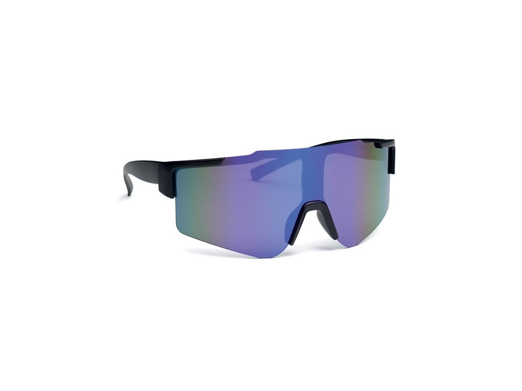 Športové slnečné okuliare so zrkadlovými sklami a čiernym rámom. UV 400 ochrana.