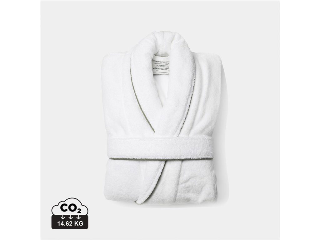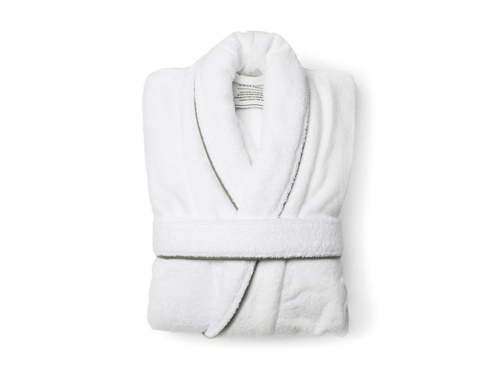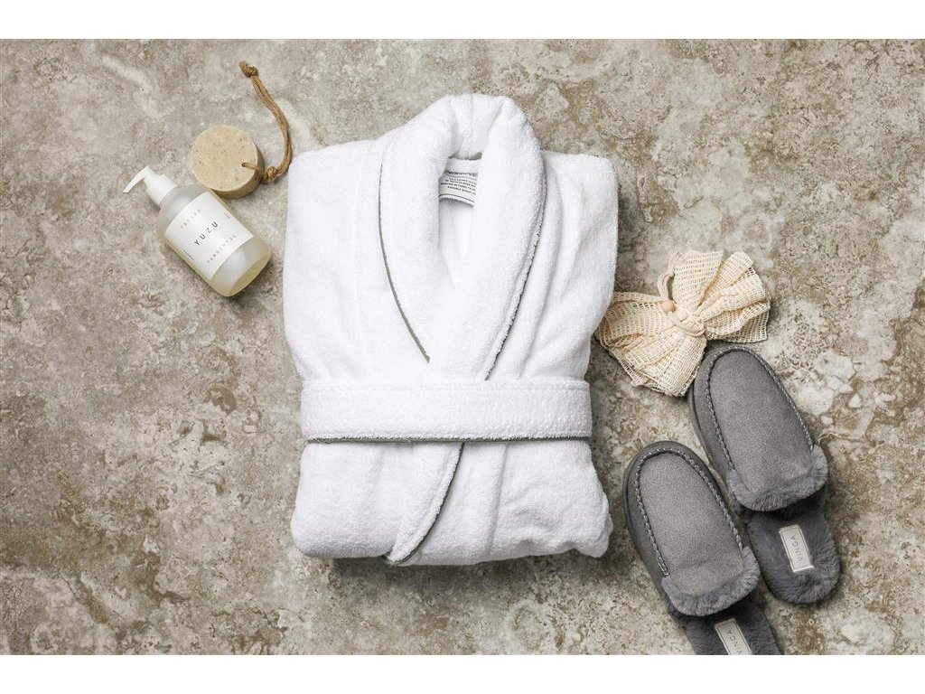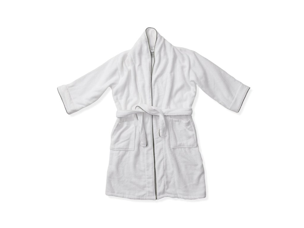 Luxusný župan zo 100 % bavlny. Jedná sa o klasický model županu s mimoriadne širokým golierom a opaskom v páse. Zdobia ho pekné detaily, ako sú skryté švy a kontrastné lemovanie na golieri. Je vyrobený z dlhých bavlnených vlákien s nekrútenými niťami.